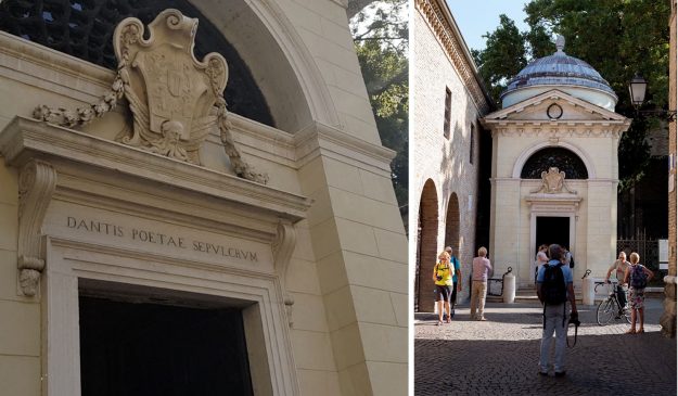 Согласно историческим данным, в этом городе Данте находит свое последнее прибежище у самого сеньора города Гвидо да Полента и заканчивает свою «Божественную комедию». В 1321 году Данте Алигьери отправляется в Венецию, дабы убедить венецианцев не нападать на Равенну. И на обратном пути он заболевает малярией, которая его погубила. В Равенне Данте был похоронен в церкви Сан-Пьер-Маджоре (ныне Базилика Сан-Франческо) со всеми великими почестями. Подеста города Гвидо да Полента, возложил на чело покойного лавровый венок. В 1486 году была возведена гробница. Спустя десятки лет Флоренция осознала кого потеряла и трижды просила Равенну отдать им прах Данте, но Равенна была непреклонна.