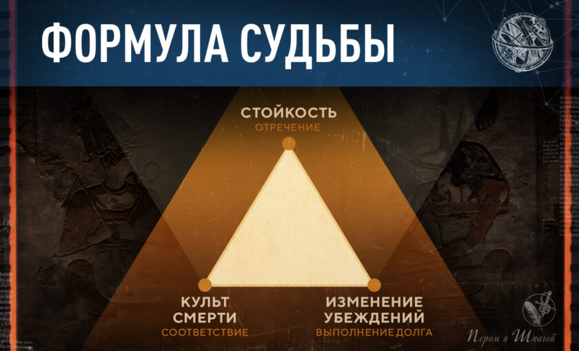 И если мы будем сравнивать с методикой Постамента, то понятное дело, что стойкость, её высшая степень — это Отречение. Чем выше Отречение, тем больше стойкости. Отсутствие дороги назад — делает человека стойким. Когда мы говорим об изменении убеждений, мы имеем дело с формой Долга. Не изменив убеждений, нельзя выполнить долг. А культ смерти — по сути, это форма Соответствия. Постамент порождает формулу, которая регулирует тремя вентилями судьбу человека. И если вы крутите только один вентиль, а два не трогаете, то судьба вас разворачивает не так, как вы хотите, а как ей угодно. Крутить надо одновременно три вентиля для того, чтобы управлять судьбой. Это три управляющие механизма, которые позволяют управлять судьбой.