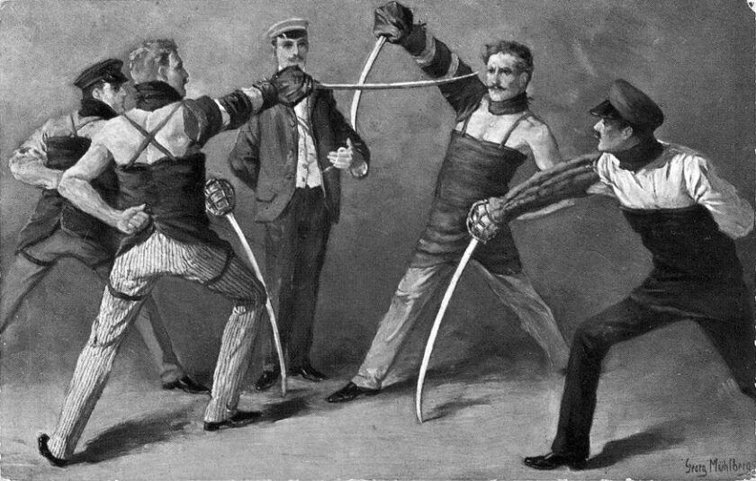 Ярким примером данного явления, служит мензурное фехтование. Мензурное фехтование в Хайдельберге на саблях и шлегерах. Основной принцип поединка состоял в обмене ударами, не сходя с места. Дуэлянтам запрещалось не только покидать позицию, но и уклоняться корпусом от уколов соперника. Их можно было лишь парировать при помощи собственного оружия. При фехтовании шлегерами неподвижными оставались и сами руки фехтующих, движения производились только кистью. Целью поединка являлось нанесение рубящих ударов по голове соперника — единственной открытой части тела фехтовальщика. При фехтовании саблей им разрешалось двигать всей рукой, а не только кистью. Эти жесткие правила были приняты всеми студенческими братствами в 50-х годах XIX века.